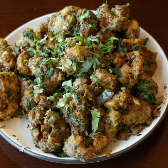 Caulifloer florets, gram flour, corn flour, ginger-garlic paste, red chili powder, turmeric, garam masala, curry leaves, green chilies, lemon juice deep fried.