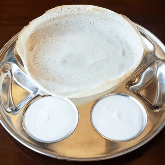Light, airy Kerala-style Appam (2 pcs)—soft in the center with delicate crispy edges, perfectly fermented. Served with coconut milk.